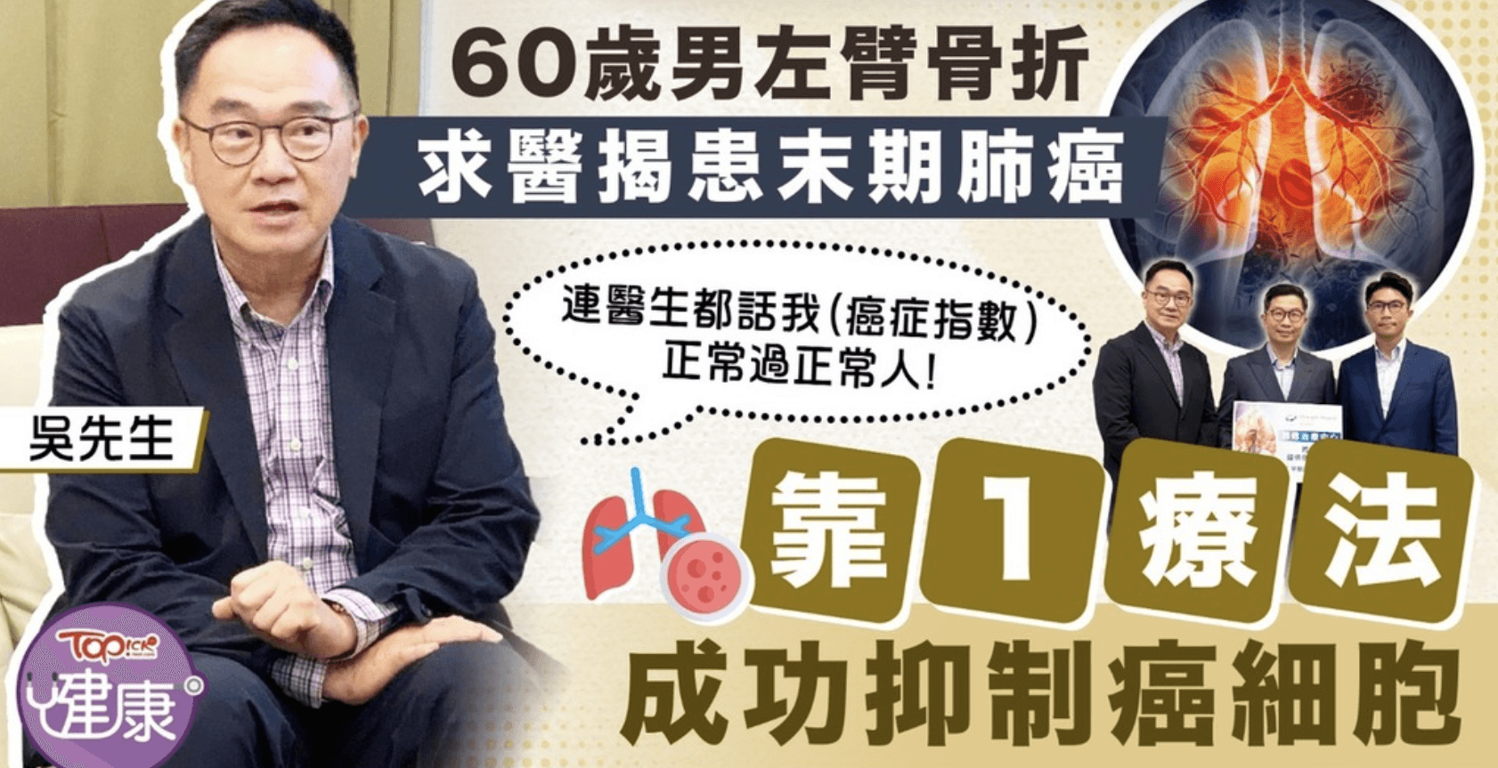現年60歲的吳先生無煙無酒,曾患甲狀腺癌並接受放射治療,他於2022年底時因肩膀痛求醫,醫生診斷為病理骨折後再進行電腦掃描,結果發現右肺葉上有腫瘤,化驗結果為第4期肺腺癌,並已擴散至胸膜及骨頭。